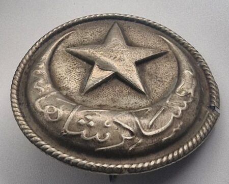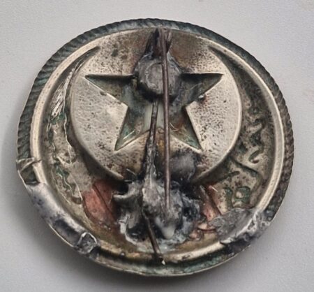 סמל הצבא העותומאני ממלחמת העולם הראשונה תוצרת גרמניה 1910-1918 סמל כסוף תלת מימדי ועליו כוכב מחומש מתחת לכוכב המחומש יש קוד אישי של הסולטן מחמט החמישי כתוב בו בערבית "אסקאר-אי שאהאנש" שמשמעותו " צבא האימפריה" / "צבא הסולטן-הצבא העותומאני"